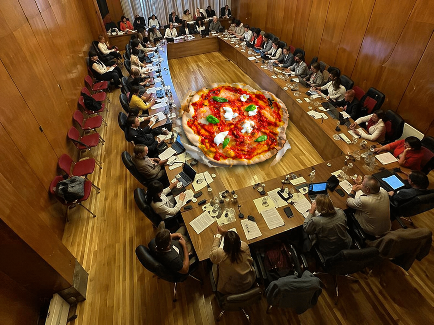 Prejeli smo nekaj odzivov na to postrežbo s picami med sejo samo in niso bile ravno laskave: ZAKAJ JE BILA HRANA PONUJENA KAR MED RAZPRAVO KAR JE VSAJ NEDOSTOJNO, ČE NE NEOKUSNO IPD., so se vrstile pripombe. Da seveda res tragikomičen paradoks, da sprejemaš strategijo kjer je v ospredju lokalna hrana in ponujaš italijansko jed ...niti ne pišemo!