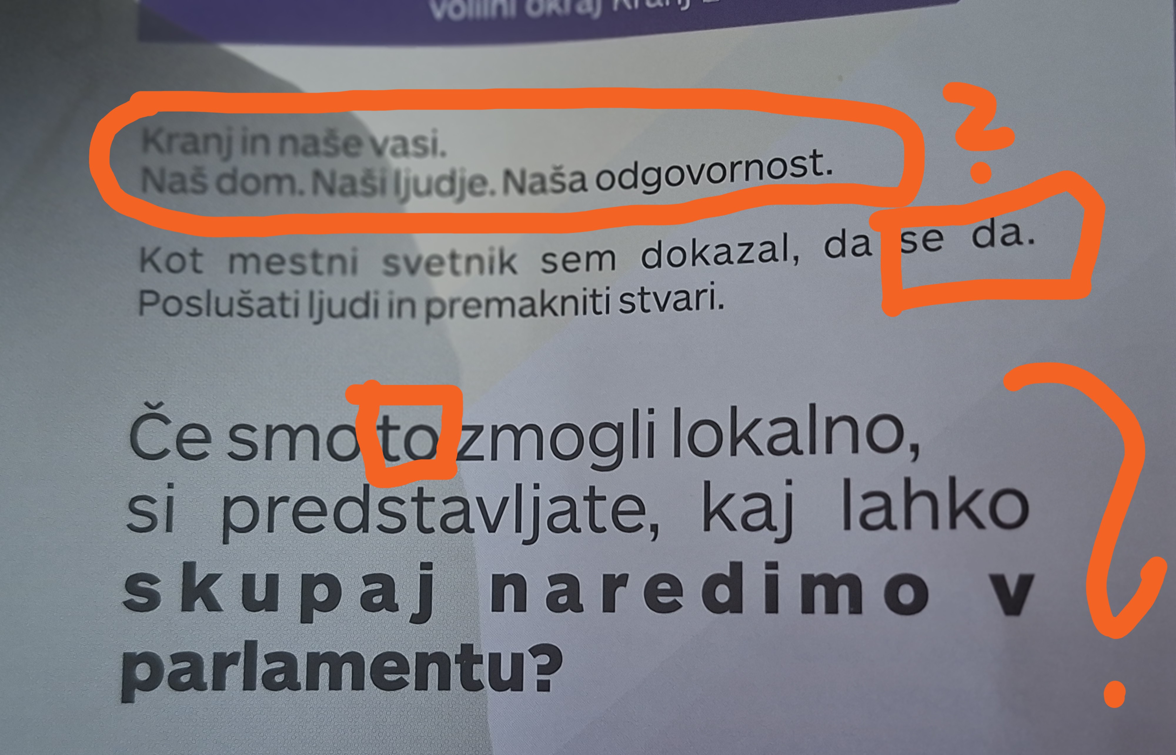 KLJUČNO VPRAŠANJE PA JE KAJ JE "TO" NA LETAKU - ZOPET (KOT V ŠTEVILNIH NASTOPIH) NAM POLITIK NI POSTREGEL S PODATKOM, KAJ JE TO "TO" KAR JE NAREDIL "LOKALNO"!? BIL JE SEDEM LET NAJBOLJ VNET V OPOZICIJI KJER SEVEDA S KAKIMI NJEGOVIMI PROJEKTI NI ŠLO, A KASNEJE JE ZLEZEL V ....ŽUPANU IN GLEJ NO, TO SE PA RES DA IN TO MU JE USPELO!?