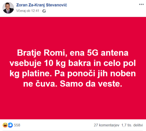 Bralka Trme nas je opozorila, da morda ni naključje, da je Zoran Stevanović "pozival" Rome naj si prilastijo (ker ni nobenih čuvajev...) drage kovine iz anten! "Še nekaj let nazaj je bil član SNS in celo podpredsednik pri Jelinčiču," smo zvedeli in se prepričali, da je res tako. Za povrh smo prejeli še oglas, ki našega mestnega svetnika postavlja v stranko, o kateri pa ne govori rad: nekoč je izjavil le, da je "zamrznil status"!? Kakorkoli že, njegov sedanji zapis o Romih na spletu je mogoče povezati tudi s tem, da je bil politično aktiven v Slovenski nacionalni stranki - ni pa nujno. Zagotovo pa je prav, da vemo, da je tudi naš Zoran že zamenjal kako politično stranko ali prepričanje.....