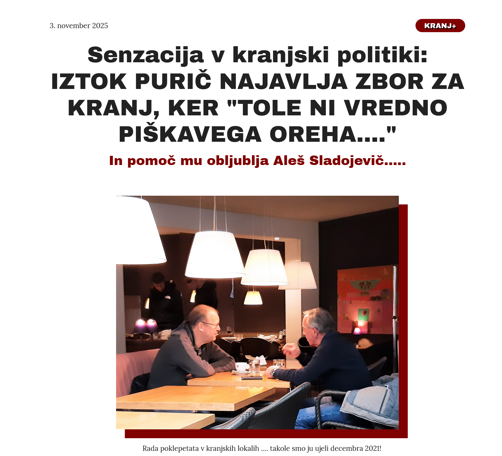 Maistrov trg, danes opoldne. Skoraj bi se zgodilo srečanje med županom Rakovcem in možnim izzivalcem na volitvah 2026 Iztokom Puričem. Pa se ni, ker je župan protokolarno vlogo prepustil podžupanji Zorkovi....Nedavno je sicer bivši minister in podpredsednik stranke Alenke Bratušek Purič najavil na spletu možnost, da zopet kandidira za župana (enkrat je že poskusil, a se ni uvrstil niti v drugi krog...) in takole ocenil stanje v Kranju: