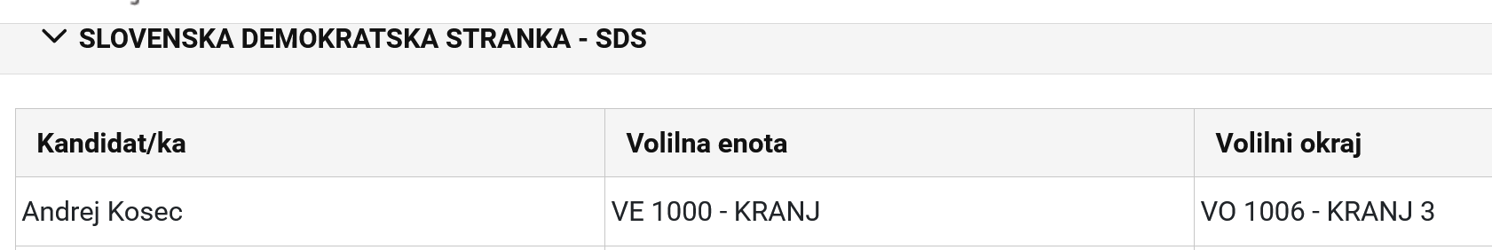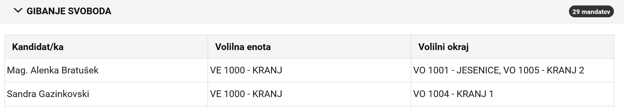 tOLE SO PODATKI DRŽAVNE VOLILNE KOMISIJE O POSLANKAH, POSLANCIH, KI BODO SEDELI V PARLAMENTU IN SOBILI IZVOLJENI V VOLILNIH OKRAJIH KRANJ 1,2 IN 3....Mandat ponavja Sandra Gazinkvski, Alenka Bratušek pa je v parlamentu tudi zaradi kandidature v Kranju in na Jesenicah, Zoran Stevanović je novinec, Andrej Kosec /SDS/ pa je na tem seznamu zato, ker je pač dobil mandat v okraju Kranj 3...sicer pa je podžupan občine Cerklje! Torej med 90 poslankami in poslanci 3 /trije/ iz Kranja....od tega dve ženski!