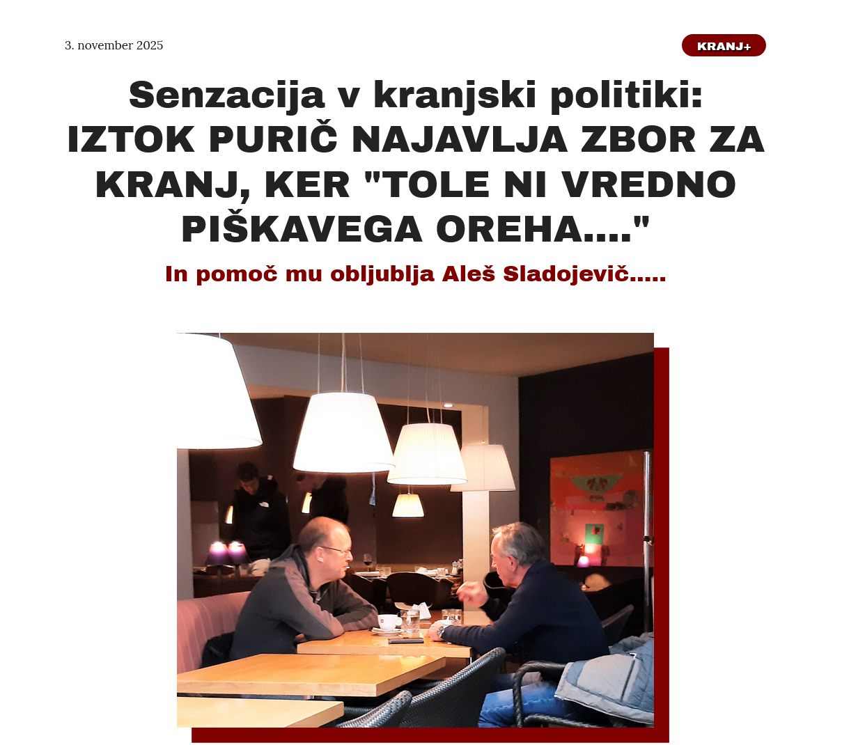 Iztok Purič je upokojenec za katerega verjetno malokdo lahko našteje zaporedje političnih pripadnosti=strank! Zato je razumljivo, da ga ne dohaja niti prosta enciklopedija, ga pa prehiteva dnevna politika. Kranjčan je zdaj kandidat na volitvah za državni zbor na listi stranke Prerod Vladimirja Prebiliča. Ja, kako, hudiča - ali ni bil nazadnje pri Šarcu, prej pri Bratuškovi ? Bil. Ampak sta oba njegova prejšnja šefa utopila stranki v Svobodi, sama pa se korajžno spopadla z novimi funkcijami in - stolčki. Nekdanji komunist Iztok pa je seveda med tem menjal stranke kot "spodnje ...."! Pa ne samo to: funkcij in položajev tudi manjkalo. Še dobro se spomnimo, kako je z Alenko Bratušek pogorel na županskih volitvah v Kranju.....Takole sta obsedela po klofuti kranjskih volivk in volivcev....