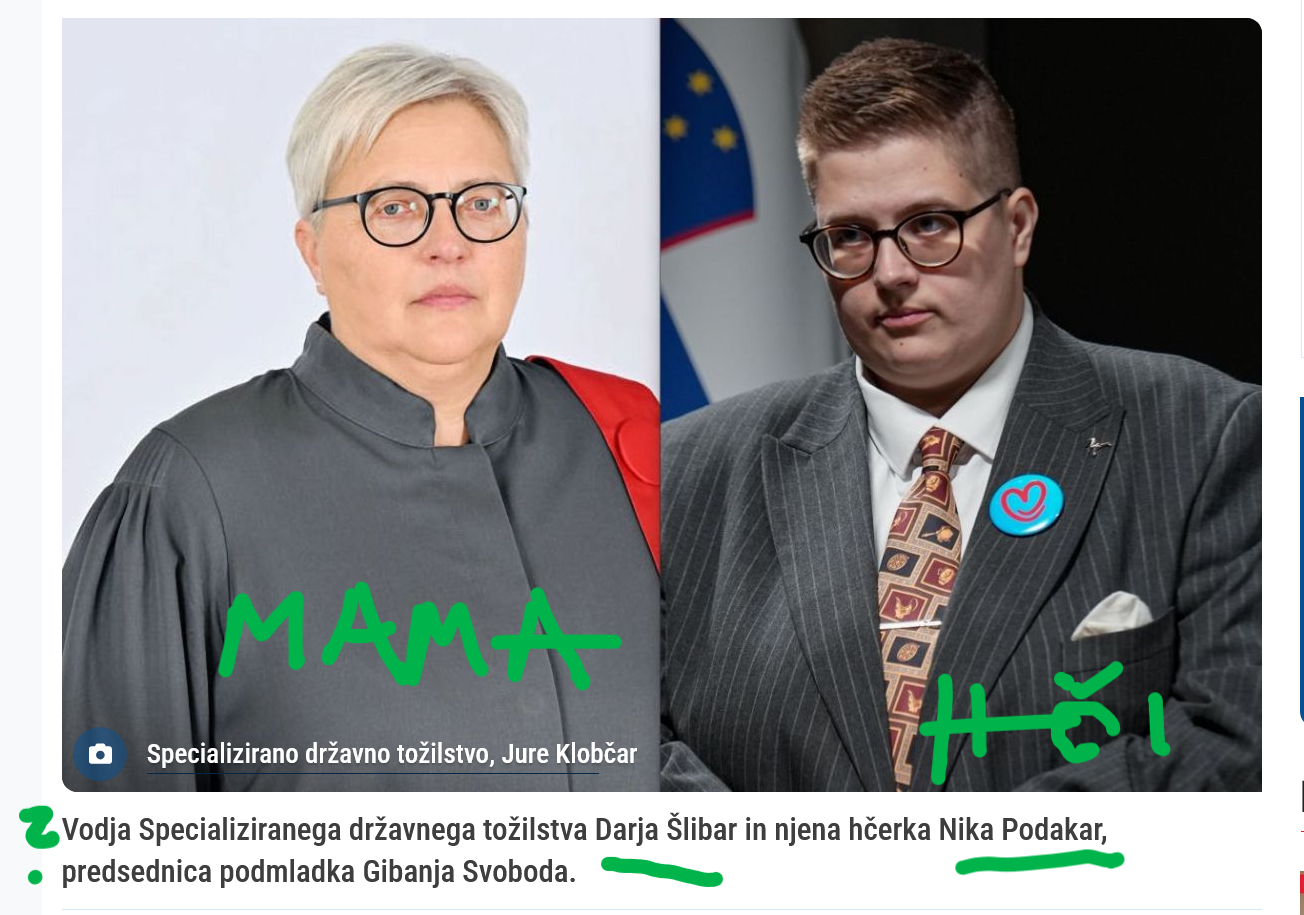 Na fotografiji sta mama in hči - Darja Šlibar in Nina Podakar (fotoReporter). Slednja je politično zelo izpostavljena v Gibanju Svoboda, mama je izpostavljena po svoji funkciji - vodi namreč izredno pomembno državno specilizirano tožilstvo. VSAJ TAKO JE OČITNO BILO, KO SO SREDI FEBRUARJA O OBEH PISALI V REPORTERJU, MI PA SMO DANES NALETELI NA - PRESENEČENJE, KI PA GA V OKVIRU URADNIH UR NISMO USPELI RAZVOZLATI.