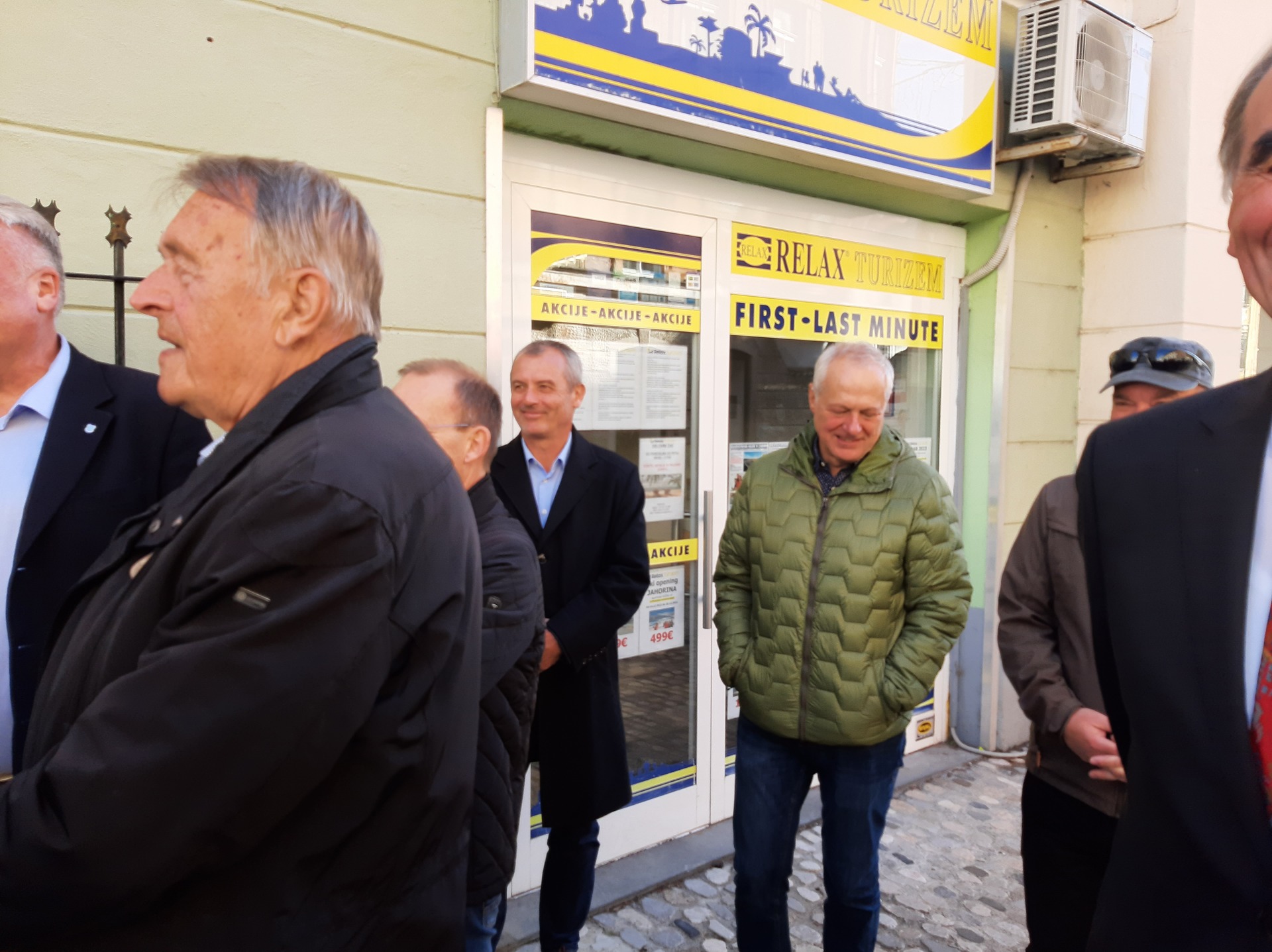 Goloba je pričakal tudi nekdanji bankir (ustanovitelj Lon-a) Slavko Erzar (spredaj) in zadaj nekoč vidna člana Več za Kranj Krišelj (levo) in Corn (desno) - kandidata stranke za mestni svet...
