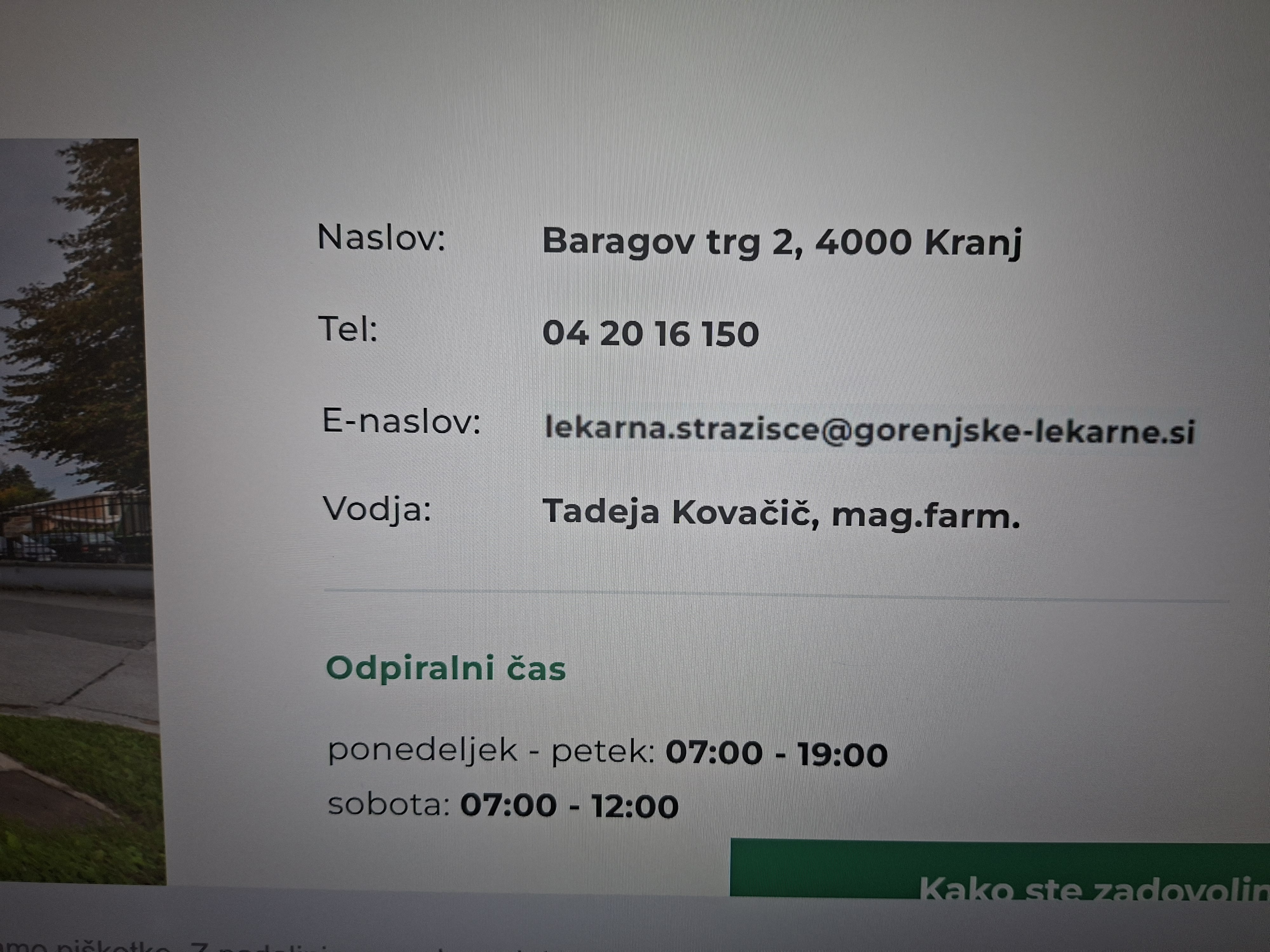 Aroganca do bolnikov, ki pridejo - kljub starosti, bolezni - morda peš pred zaprta vrata Lekarne Stražišče je res nekeaj sramotnega. Predvsem zato, ker je bil klic na številko 04 201 61 50 tak, da je lahko res razjezil našo bralko, ki nas je opozorila "na norčevanje iz ljudi", ker je avtomatski odzivnik sporočal, da bo več znanega v - novembru?! LETO 2025 JE ŽE MINILO, TOREJ GRE ZA NOVEMBER 2026? JE BILA JEZNA BRALKA, MI PA SMO POISKALI ODGOVOR IN GA PREJELI DANES: