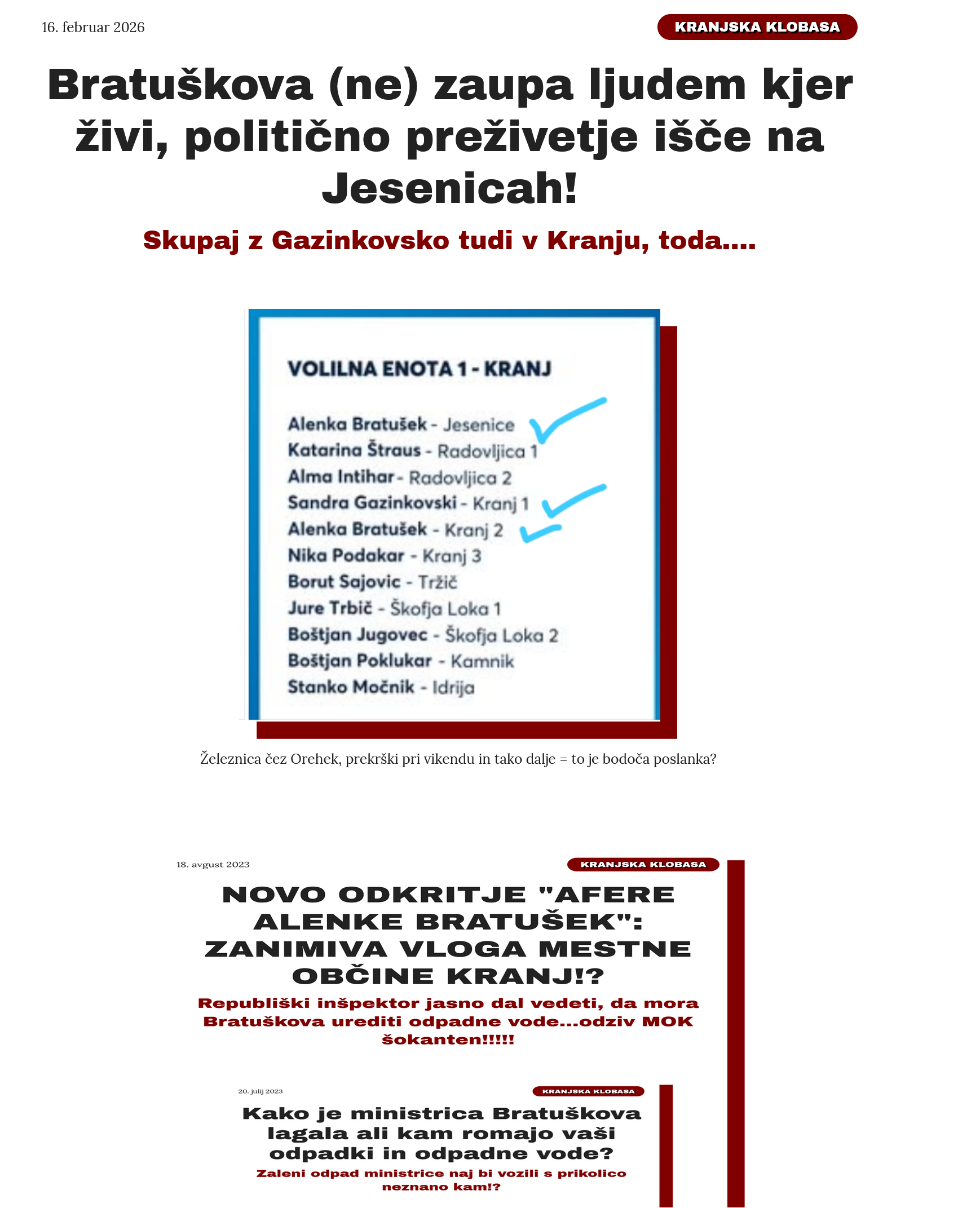 Nismo strokovnjaki, a tole bo razburilo marsikoga - pa čeprav je to res tista prva faza, ko je vse mogoče. Saj je bilo na Orehku tudi, kajne? KOMU BI VLAK PELJAL ČEZ ALI POD ALI MIMO HIŠE, JE MOGOČE VIDETI. JASNO JE, DA BO ŠE VELIKO MINISTROV IN MINISTRIC MENJALO STOLČKE, PREDEN SE BO KAJ ZGODILO, A ŽE V TEM ČASU ZBIRANJA PRIPOMB JE TREBA BITI PREVIDEN: KO ALENKA BRATUŠEK /IMENOVANA ZARADI FUNKCIJE/ KAJ ZAČNE RISTATI, JE HUDIČ.... ČE NAJVEČJI OPTIMISTI PRIČAKUJEJO GRADNJO GORENJSKE BOLNIŠNICE ČEZ DESETLETJE, KDAJ BO ŠELE TOLE DOBILO KAKŠNO KONKRETNO PODOBO? Mimogrede, še tole ... marec bo zdaj zdaj tu!
