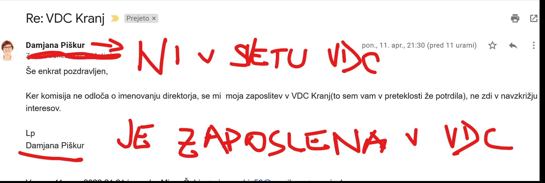 Najprej: Damjana Piškur /Več za Kranj/ ne sedi v svetu zavoda VDC Kranj in so zato taka podtikanja zanjo škodljiva in seveda ima prav. PO DRUGI STRANI PA JE DAMJANA ŠE KAKO VPETA V VDC KOT ČLANICA KOLEKTIVA, KI GA VODI DIREKTORICA MIRJANA ČESEN! ZA POVRH PA DAMJANA PIŠKUR DOPOLDNE DIREKTORICO UBOGA, POPOLDNE PA KOT MESTNA SVETNICA VEČ ZA KRANJ IN ČLANICA KADROVSKE KOMISIJE O NJENI USODI - ODLOČA. Ker pa po njeni oceni MO Kranj daje samo mnenje in ne odloča neposredno o direktorici, se ji taka vloga ne zdi nezdružljiva in je seveda mirno glasovala in podprla direktorico Česnovo...MI BOMO NA VSE ODGOVORE MORALI POČAKATI DO ČETRTKA, KO NAM JIH JE SLEDNJA OBLJUBILA. ZANESLJIVO PA JE STVAR POLITIČNE IN ČLOVEŠKE ETIKE ODLOČATI O PODPORI DIREKTORICI, KI SI JI V SLUŽBI PODREJEN. ČE JE NE PODPREŠ, IMAŠ LAHKO TEŽAVE NA DELOVNEM MESTU, ČE PA JO- POTEM IMAŠ LAHKO KAKŠNO KORIST OD TEGA. Gospa Piškurjeva je politično vlogo nasledila v nekdanji SZNKS od moža, ki je potem dobil službo na občini v času Mohorja Bogataja. Kot predsednica KS Zlato polje je v nasprotju z delom občanov podpirala postajo pri porodnišnici in šolah...potem pa odstopila. In tik pred volitvami zapustila "svojo" stranko, ki jo je vodila in postala del Trilarjeve Več za Kranj kjer je mestna svetnica od 2018 in članica kadrovske komisije. (Ne)znana je zlasti po tem, da bi njene razprave v vseh teh letih mizar preštel na prste ene roke...