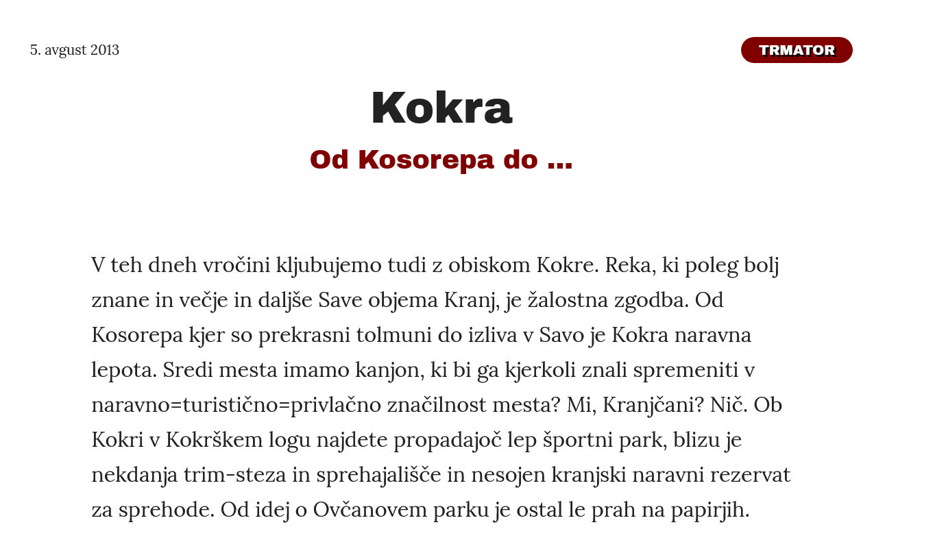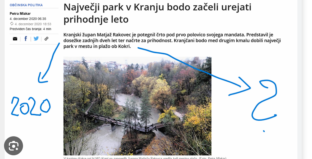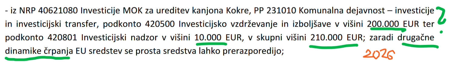 Kaj pomeni "drugačna dinamika črpanja"!? Spomnimo se, da je bil Kranj zaradi stega župana in iste vodstvene in uradniške posadke pri prenovi trgovske šole ob 1,2 milijona evropskih in državnih sredstev, ker jih niso znali ustrezno črpati! Kanjon Kokre pa je eden od obljubljenih projektov Matjaža Rakovca /mimogrede: ob Kokri ima hišo.../ od samega začetka politične kariere. PO OBLJUBAH ZGORAJ IZ LETA 2023 BI MORALI ŽE LANI V AVGUSTU ZADEVO DOKONČATI...PA SE OČITNO NITI ZAČELA NI. PA SMO ŽE LETA 2026 IN ZDAJ JE NA PREDLOG ŽUPANA MESTNI SVET SPREJEL SKLEP, DA 210 000 EVROV V LETOŠNJEM PRORAČUNU "PRERAZPOREDIJO" DRUGAM....