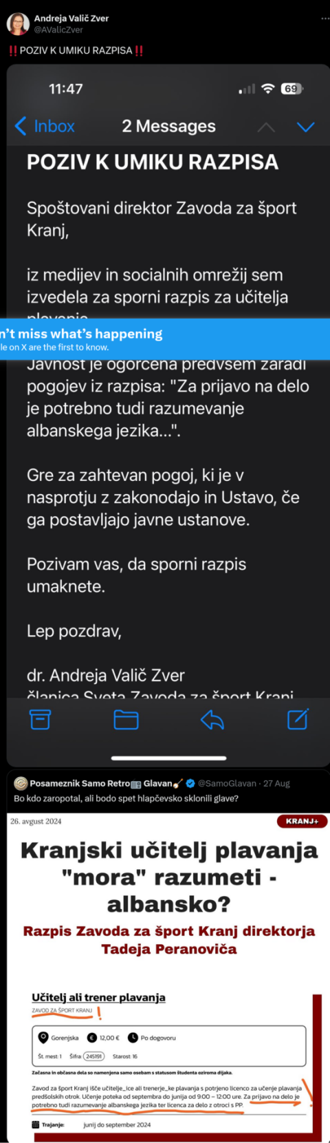 Glede razpisa za direktorja Zavoda za šport se dogodki odvijajo v skladu s pričakovanji. Svet zavoda mi je na zadnji dan, ko sem še lahko vložil pritožbo, omogočil vpogled. Mejl je bil poslan ob 14:24.