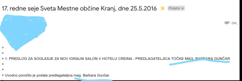 Ne presojamo o objavljenem, poudarjamo pa: vsi dobički (letni promet v Kranju preko 3 000 000 evrov, 200 obiskovalcev vsak dan, 24 ur odprto...) gredo seveda lastniku! Žal v gradivu občine o tem, kdo je lastnik slovenskega podjetja in s tem bodoče igralnice - nič. Prav tako je naravnost tragično, da ni priložen niti podatek (iz zakona...) o tem, da bo koncesijo država podelila za do 10 let in jo potem lahko imetnik podaljšuje...VSE TO SO PODATKI O TEM, KAJ Z ODLOČITVIJO MESTNIH SVETNIKOV PRIDOBIVAMO ALI IZGUBLJAMO. Ni nobenega dvoma, da se na Planino s taksiji ne bodo vsak dan vozili bogati igralci ampak bo tam prenekateri Kranjčan zapravil plačo - tako je pač z igralnimi avtomati. PRAV TAKO JE RES, DA JE DOSTOP DO IGER NA SPLETU IPD. TAKO REKOČ NEOMEJEN - A O TEM NE ODLOČAJO V MO KRANJ, O 105 AVTOMATIH PA! ČE JE RES VSE TAKO IDEALNO, KAR V ŠENČUR - TAM KOMAJ ČAKAJO NA IGRALNICO! ZA POVRH IMAMO V KRANJU ŽE PODELJENI DVE KONCESIJI, EN IGRALNI SALON DELUJE.Tole pa je sporočil redakciji poznan (imamo vse podatke) prebivalec MO Kranj o "odnosu do okolja" Admiralovih šefov iz Lesc: "PROSIL SEM JIH ZA POMOČ MLADIM ŠPORTNIKOM IN ODPIKALI SO ME KOT MULCA, DA JIM TEGA NI TREBA, DA PLAČAJO VSE DAVKE...RES JE IN IMAJO PRAV, SAMO NE NASEDAT ZGODBAM O HUMANEM IGRALNIŠTVU!"