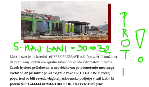 Ko smo hoteli preveriti navedbe podžupana Janeza Černeta /SD/ o poteku sej lani, ko so svetniki zavrnili igralnico v Kranju, smo bili presenečeni: URADNEGA DOBESEDNEGA ZAPISNIKA SEJE NAMREČ NI TAM KJER SO VSI ZAPISNIKI SEJ! KER SMO BILI NOVINARJI NA SEJI PRISOTNI, BI BILO SEVEDA ZANIMIVO DANES PREVERITI STALIŠČA IZ MAJA 2021. A TO NI MOGOČE: NAMERNO, NAKLJUČNO ALI PA JE VSE TO DEL KOLOBOCIJ POD DELOVNIM NASLOVOM "KAKO BOMO KRANJU PODTAKNILI IGRALNICO"?