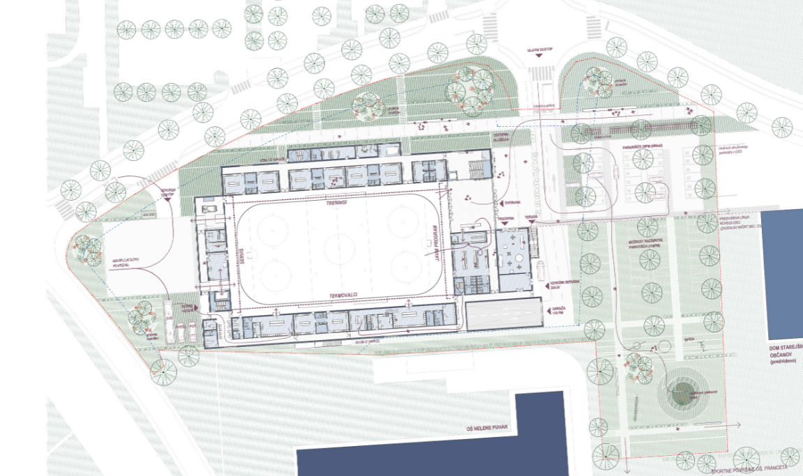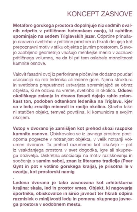 "Urbanistična zasnova izhaja iz obstoječe prostorske strukture območja ter iz usmeritev, opredeljenih v natečajni nalogi. Območje zaznamuje niz večjih javnih stavb z izrazito vlogo v prostoru - OŠ Helene Puhar, OŠ Franceta Prešerna ter istoimenska Gimnazija FP.. Ledena dvorana je umeščena v osrednji del šolskega območja in se navezuje na obstoječe in predvidene prometne, peš in krajinske povezave. Objekt postane del širšega sklopa javnih programov, ki skupaj oblikujejo nov prostor. Oblikovanje stavbne mase se zavestno zgleduje po sosednji Osnovni šoli Franceta Prešerna arhitekta Stanka Kristla. Tako kot šola tudi ledena dvorana - kolikor je to mogoče - s svojo stopničasto razporeditvijo volumnov zmanjšuje zaznano merilo velikega objekta in ga približuje človeškemu merilu. S tem se velika javna stavba vključi v obstoječi prostor kot del širše urbane strukture in ne kot samostojen, izoliran volumen".