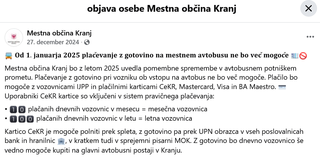 Tržni inšpektorat RS je prejel vaše zaprosilo za posredovanje dodatnih pojasnil glede inšpekcijskega postopka zagotavljanja plačila storitev avtobusnega prevoza v Mestni občini Kranj z gotovino, to je eurobankovci in eurokovanci. Trdite, da je ukrepe v zvezi z onemogočanjem uporabe gotovine dokazano uvedla MO Kranj preko koncesionarja. Zanima vas, ali je MO Kranj glede na to in druge okoliščine (nedostopnost kartice Cekr na ustrezno dovolj mestih) deležna kakršnegakoli ukrepa oziroma postopka z vaše strani za katerokoli sporno aktivnost in ali je postopek zoper MOK zaključen. Tržni inšpektorat RS podrobneje pojasnjuje, da ZUE jasno določa, da je za storitev prekrška po prvi točki prvega odstavka 23. člena odgovorna pravna ali fizična oseba, ki opravlja dejavnost, ki po dnevu uvedbe evra ne sprejema evro bankovcev in kovancev. Skladno z ugotovitvami imenovanega inšpektorata je ponudnik avtobusnih prevozov odgovoren za izvajanje vseh nalog, povezanih z izvajanjem gospodarske javne službe mestnih linijskih prevozov v MO Kranj, kar vključuje tudi zagotavljanje vseh predpisanih načinov plačila prevoza uporabnikom mestnih prevozov. Torej izvajalec mestnih linijskih prevozov ima dolžnost, da naloge izvaja skladno s pogodbo in skladno s hierarhično višjimi predpisi, tj. zakoni in evropskim pravom, vključno z zagotavljanjem plačil z bankovci in kovanci skladno z ZUE. Glede na to da smo vam v predhodnem dopisu že sporočili, da se je zoper dejanskega ponudnika avtobusnih prevozov izvedel inšpekcijski postopek, v katerem so bile ugotovljene nepravilnosti iz naslova določb ZUE, se je zoper tega zavezanca ustrezno prekrškovno ukrepalo. Ker odločitev prekrškovnega organa še ni pravnomočna, ima kršitelj zoper odločbo pravico do vložitve pravnega sredstva.