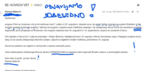 V četrtek zvečer bi morala biti na Vovkovem vrtu v središču mesta pri Khiselsteinu filmska predstava. Vstopnine ni bilo, predstave tudi ne: "Prijateljica spremlja filmsko dogajanje in nas je opozorila sicer prej pogosto najavljan dogodek. Ker pa je zanj treba prinesti stole, če želiš sedeti in uživati, smo lepo nosili stole kot za na plažo. Jasno: peš kot se za mestno jedro spodobi. Tam pa ni bilo nič in nismo mogli verjeti očem. Ko smo začeli "guglati" stran zavoda za turizem in kulturo, je bilo nemogoče najti kako obvestilo o odpovedi ali čem podobnem. Na posebni spletni strani je dvoumno obvestilo kjer lahko sklepaš, da bo film v Layerjevi hiši...no tudi tam seveda ni bilo nič!" smo slišali od družbe, ki ne živi v mestu ampak na obrobju!!!!