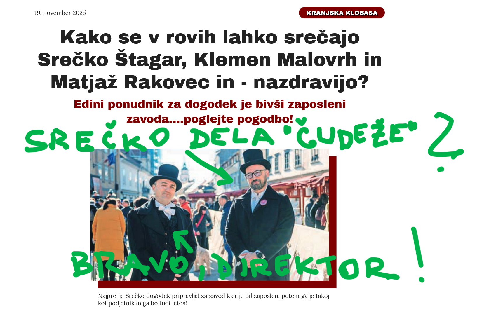 Da že tretje leto organizira Vinsko pot v kranjskih rovih tisti, ki jo je prej organiziral kot zaposleni v zavodu, je dejstvo. SREČKO ŠTAGAR je zapustil zavod in domala v istem trenutku postal ZUNANJI IZVAJALEC DOGODKA, KI MU JE DO ZDAJ PRINESEL KAKIH 45 000 EVROV PRIHODKOV! Če pustimo ob strani dejatvo, da je gospod viden član stranke SD, njen kandidat na volitvah in tako povezan z županom MATJAŽEM RAKOVCEM PO POLITIČN I PLATI, je bllo poučno n zanimivo tole: