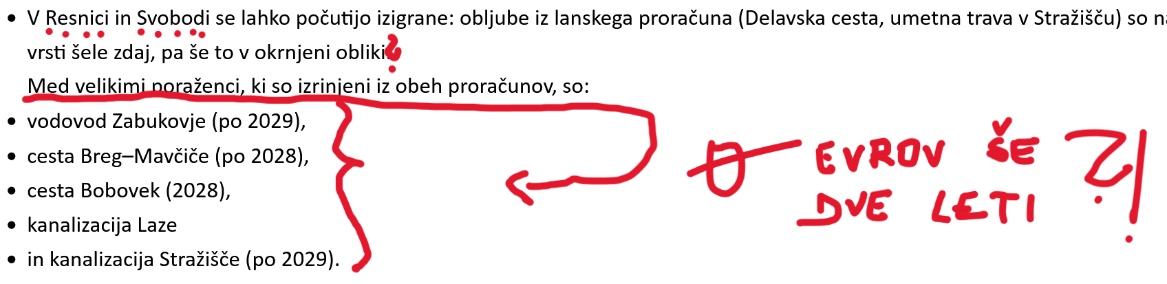 Proračuna za 2026 in 2026 sta na klopeh naših svetnic in svetnikov in ta sreda je PRVI ODGOVOR O TEM, ALI RES VERJAMEMO ŽUPANU, KI V SEDMIH LETIH NI URESNIČIL NITI ENEGA VEČJIH PROJEKTOV (OD KONCERTNE IN HOKEJSKE DVORANE DO AVTOBUSNE POSTAJE IPD. IN NOVIH (OBČINSKIH) STANOVANJ IN DELOVNIH MEST, KI JIH JE OBLJUBLJAL! Zdaj nam pripravlja proračuna, ki sta vredna premisleka in seveda razprave. A o njih razpravljajo tisti, ki so do zdaj pokazali dramatično neprizadetost do početja oblasti Matjaža Rakovca, ki bi - kot smo že objavili - veselo večal število zaposlenih...ZDAJ NAM PREDLAGA ASTRONOMSKO ZADOLŽEVANJE, KI BO BREMENILO TO IN NASLEDNJE GENERACIJE KRANJČANK IN KRANJČANOV!