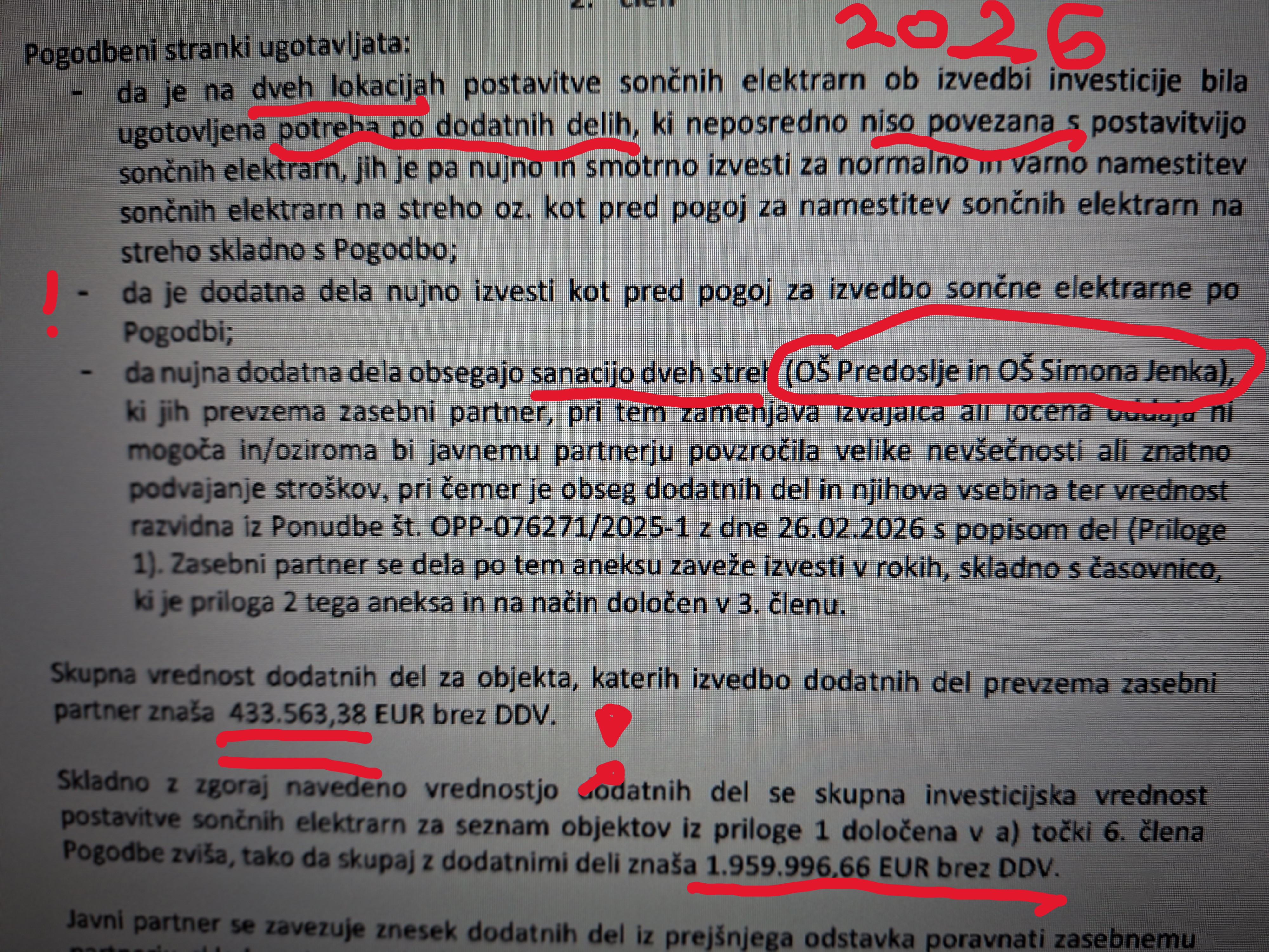 Že zdaj se je znesek za namestitev ipd. sončnih elektrarn povečal za 4 33 000 evrov. Razlog je opisan spodaj...in JE GROZLJIV, KER JASNO DOKAZUJE, DA MO KRANJ /URADNIŠTVO MATJAŽA RAKOVCA/ OB PODPISU POGODBE PRED 8 MESECI N I V E D E L O, P O Z N A L O VSAJ NA DVEH STREHAH. ČE SMO NATANČNI: PODPISALI SO POGODBO IN "SEDLLI V KOPRIVE", KER JE ZA SAMO TI DVE STREHI POTREBNIH ŠE POL MILIJONA PREDEN BODO SONČNI ELEKTRARNI SPLOH LAHKO POSTAVILI...