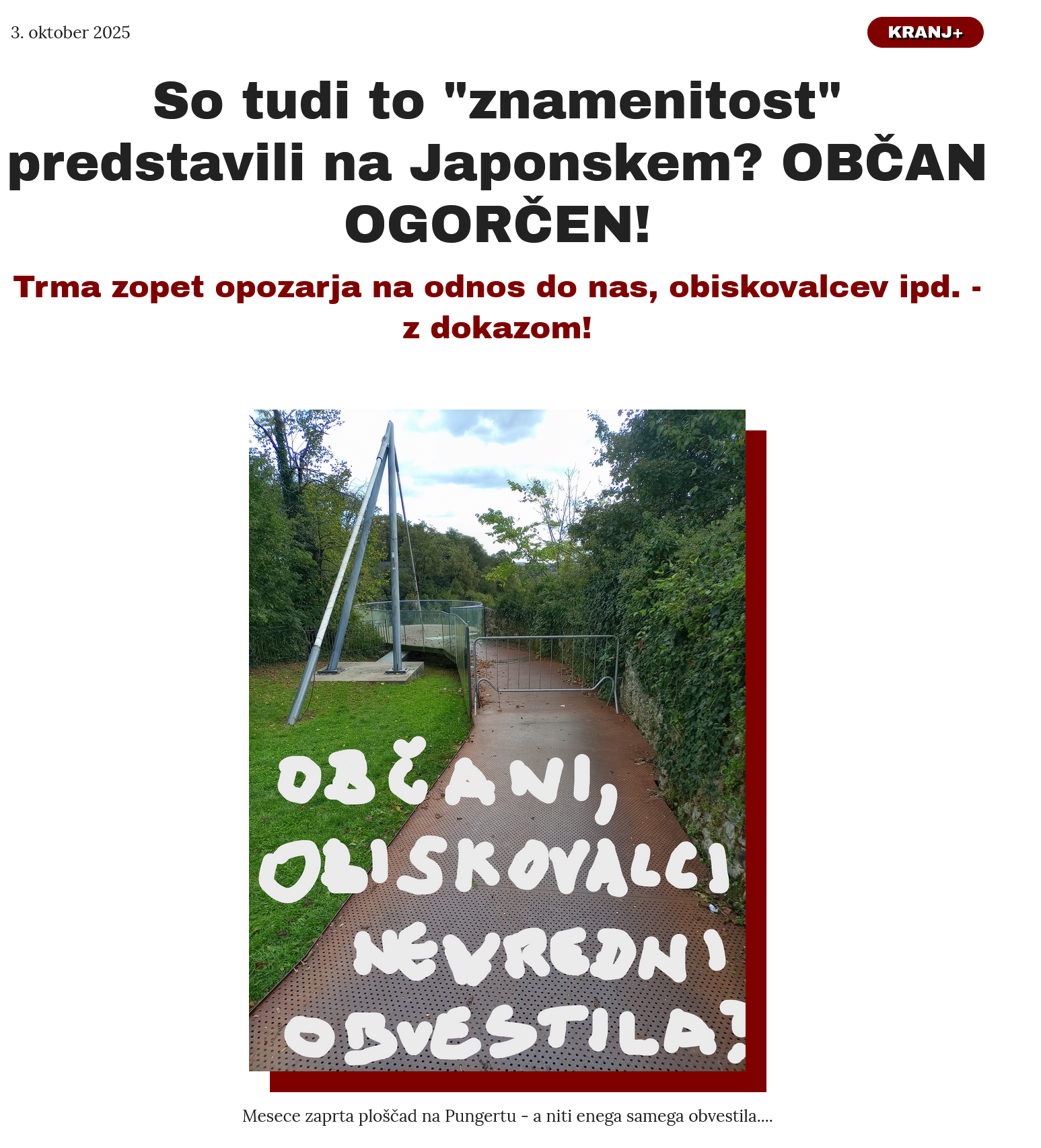 Leto in dan zaprta razgledna ploščad na Pungertu pa je manj kot streljaj proč od klavrno pozabljenega spomenika....da o zaprti kavarni, ki je v lasti občine in jo upravlja isti zavod za turizem, ne pišemo....Spomenik Janezta Nepomuka je umetniško delo, del naše dediščine in zdaj - presodite sami - v posmeh mestu katerega župan rad po svetu oznanja naše dosežke - doma pa so podobe tudi drugačne!
