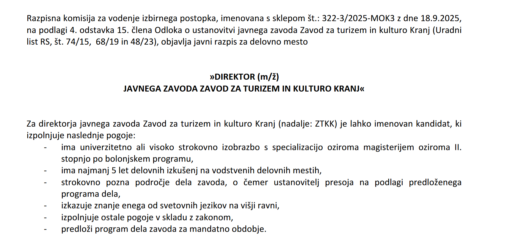 Tole je razpis, ki smo ga našli na strani Zavoda za turizem in kulturo Kranj. Kje so ga še objavili, ne vemo...Da bo vse po regelcih bo skrbel "glas iz ozadja"! TAKOLE PA JE BIL NEPOSREDEN ŽUPAN MATJAŽ RAKOVEC OB IMENOVANJU KLEMENA MALOVRHA ZA DIREKTORJA ZAVODA, KI PREJME LETNO OKOLI 1,1 MILIJONA EVROV JAVNEGA DENARJA IZ NAŠIH ŽEPOV...
