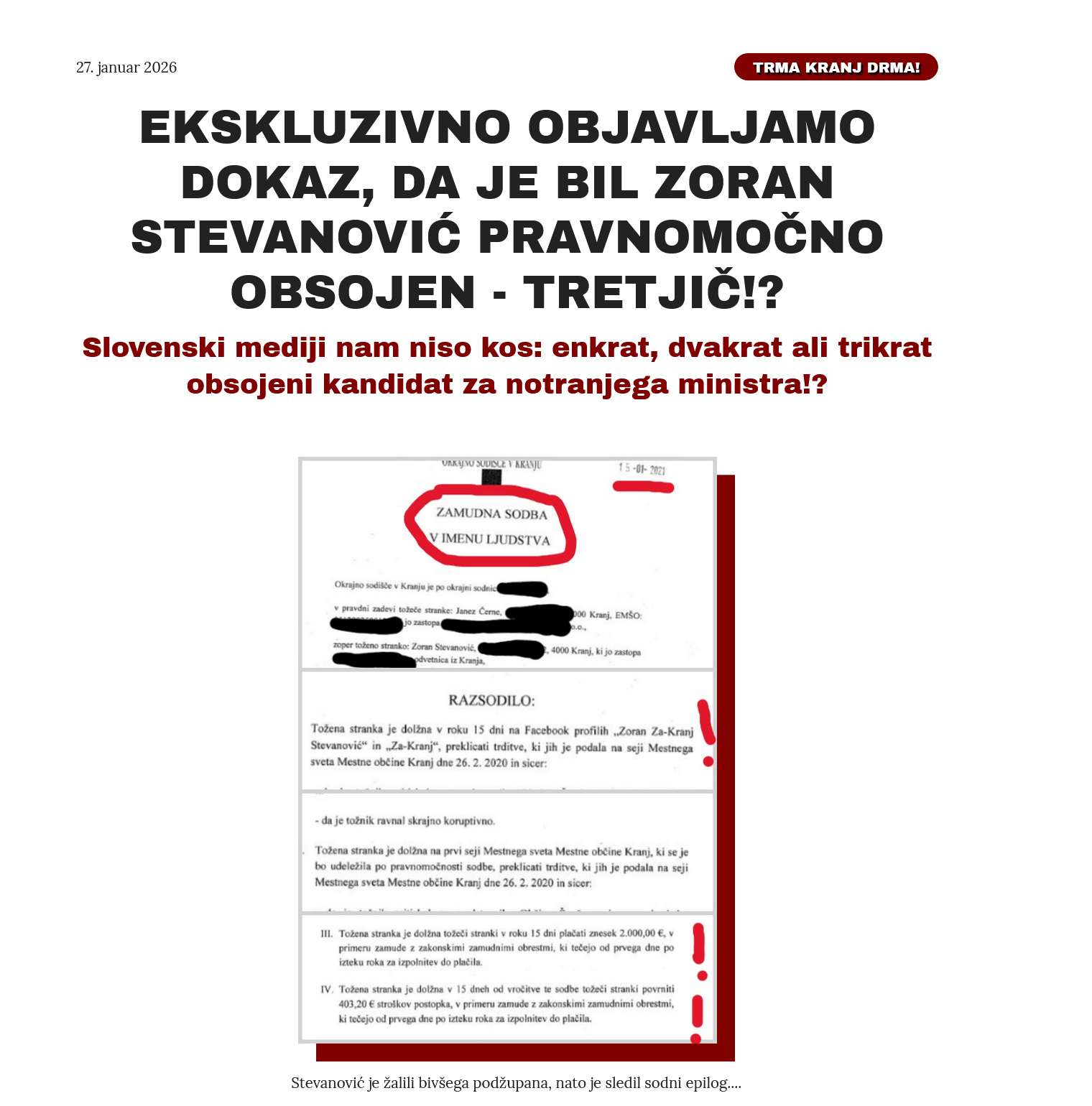 Slovenski sodniki bodo od zdaj naprej prisegali Zoranu Stevanoviću, ki je bil vsaj trikrat pravnomočno obsojen! To pa je redkost in posebnost s katero se lahko ponaša demokratična Slovenija! Mimogrede: njegova pod od varuha reda in miru do pravnomočno obsojenega zaradi kaznivih dejanj je morda osnova za film, dramo....Kajti kot podjetnik je trdo garal!