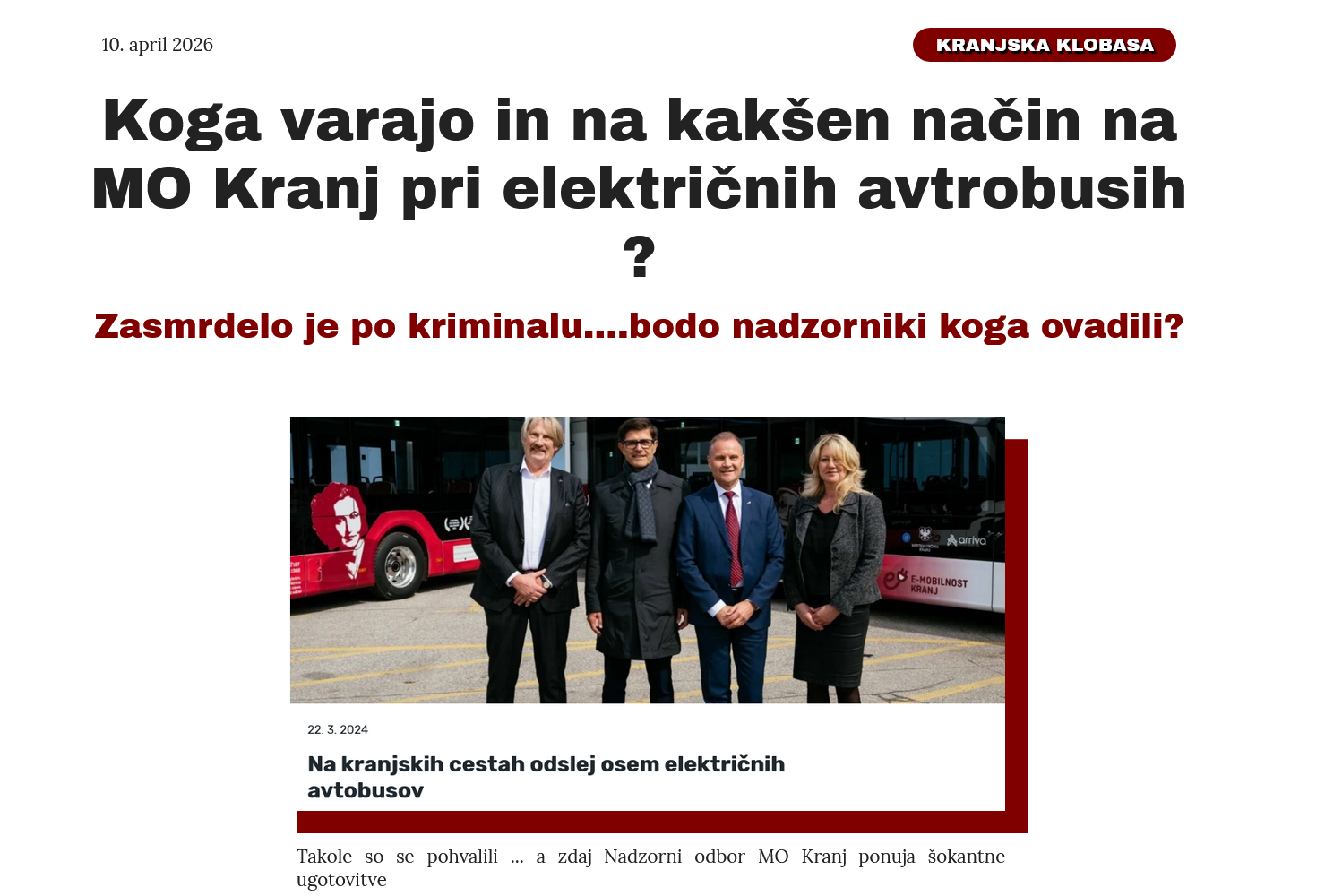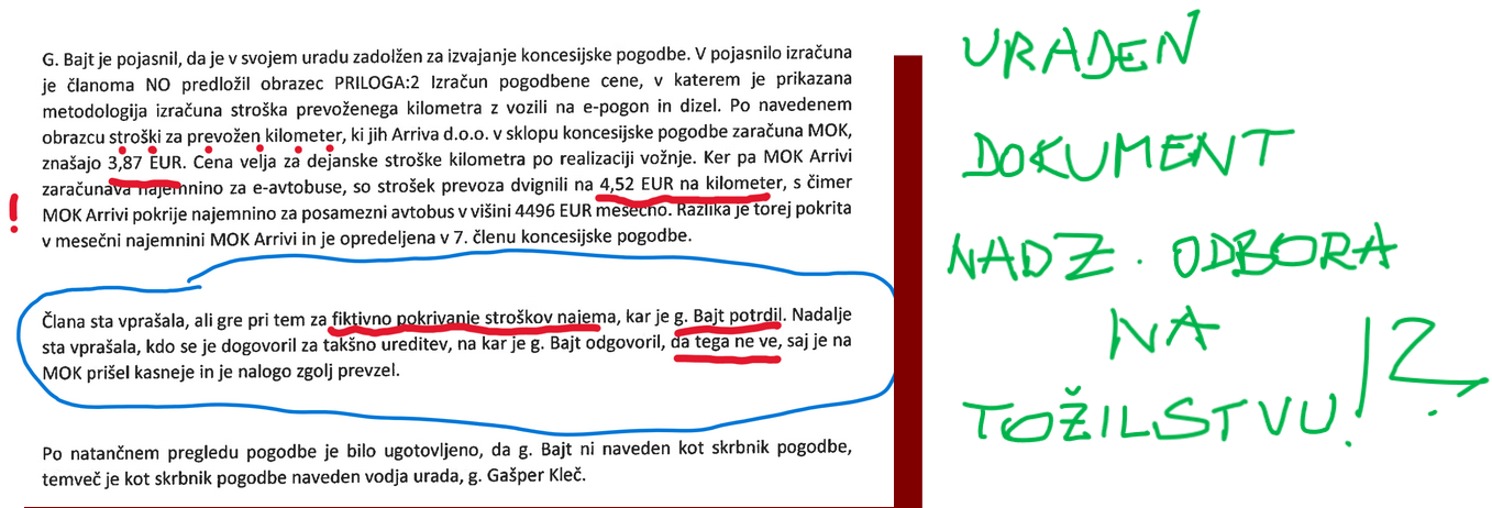 Zgornji dokument imajo v rokah državni preiskovalni organi. Ni nobena skrivnost, je javno objavljen dokument Nadzornega odbora MO Kranj glede najema električnih avtobusov, ki jih je kupila MOK tudi s sredstvi drugih virov (evropski, državni denar...), v najemu pa jih ima podjetje Arriva, tuji koncesionar mestnih prevozov. DOKUMENT JE PODLAGA ZA SUM KAZNIVIH DEJANJ KJER SE LAHKO POGOVARJAMO O GOLJUFIJI, ZLORABI POLOŽAJA IN ŠE ČEM. Tako je to opisal mestni uradnik (glej zgoraj):