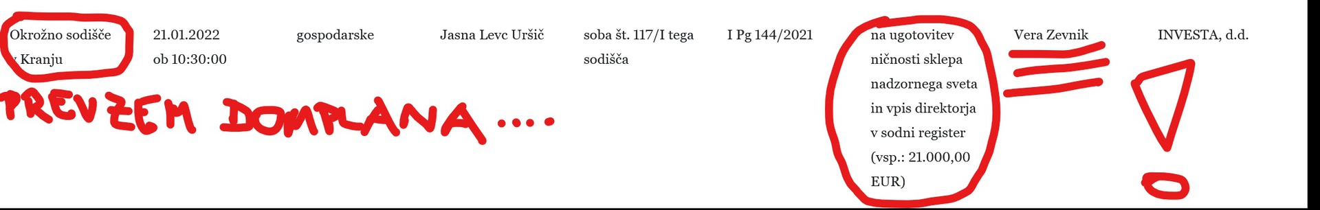 Jutri bo na kranjskem sodišču "pravna poslastica": bivša "alfa in omega" Domplana in Investe toži "svoje" podjetje, ker so jo po razkritju /tudi Trme/ odstavili zaradi domnevno sporne vloge pri prevzemu kranjskega podjetja, ki je v solasti zaposlenih, bivših zaposlenih in drugih. VERA ZEVNIK NAJ BI NAMREČ V NAVEZI S PREVZEMNIKOM SKUŠALA OMOGOČITI PRODAJO DOMPLANA KONKURENČNEMU PODJETJU. A TO JE ZDAJ ŽE ZGODOVINA, KER SO JO PO KRATKEM POSTOPKU "ZBRCALI" IZ PODJETJA KJER JE ZAPOSLILA SVOJO HČI V RAČUNOVODSTVU IN PODOBNO. TODA ZDAJ JUE NA VRSTI SODNI OBRAČUN IN KOT ZAPIŠEMO VEDNO: ŠELE PRAVNOMOČNO KONČANI POSTOPEK BO DAL ODGOVORE O TEM, KAJ SE JE DOGAJALO ZNOTRAJ PODJETJA KJER SO BILI MNOGI NARAVNOST ZGROŽENI NAD POČETJEM ZEVNIKOVE. Kaj je bil njen motiv, ni težko predvidevati: za stotisoče evrov gre....