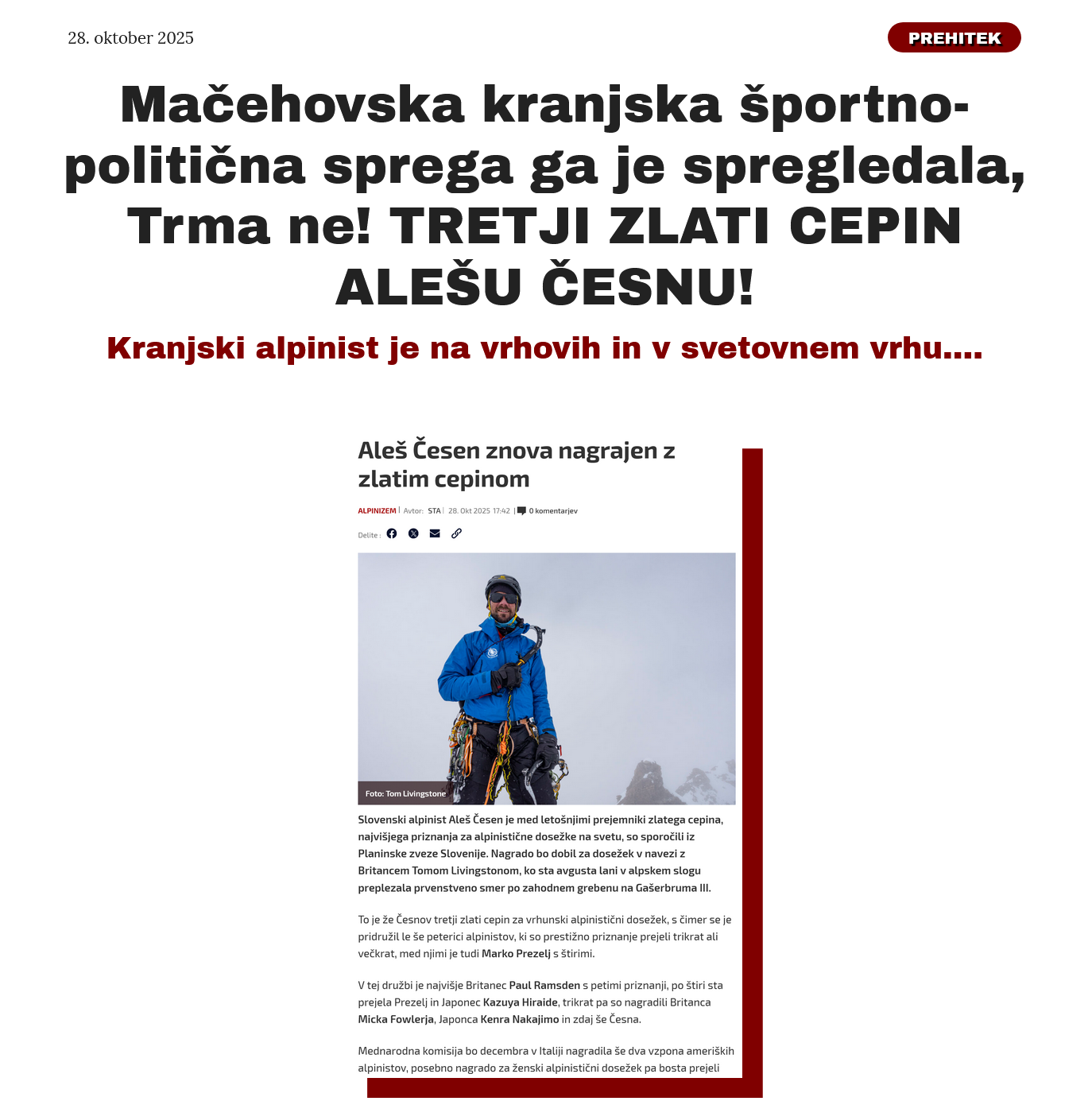 Za primerjavo gre, ne za kako zavist ali karkoli podobnega. Letos je za dosežke v 2024 dobil tretjič Zlati cepin kranjski alpinist, športnik ALEŠ ČESEN. Pa kaj! Kriteriji niso taki, da bi ta izjemni podvig upoštevali tisti, ki krojijo šport ipd. v Kranju. Aleš Česen ni dobil nobene občinske nagrade, priznanja. PA IMA ŽUPAN RAKOVEC PRAVICO, DA NAGRADI KOGAR ON IZBERE. PA NE OPOREKAMO NJEGOVI IZBIRI NIKDAR, LE ALEŠA ČESNA SE ŠE NI SPOMNIL, ČE ŽE NE SODI V KRITERIJE PRI DODELITVI ŠPORTNIH PRIZNANJ IPD. TO PA JE ŽALOSTNO, KAJNE?