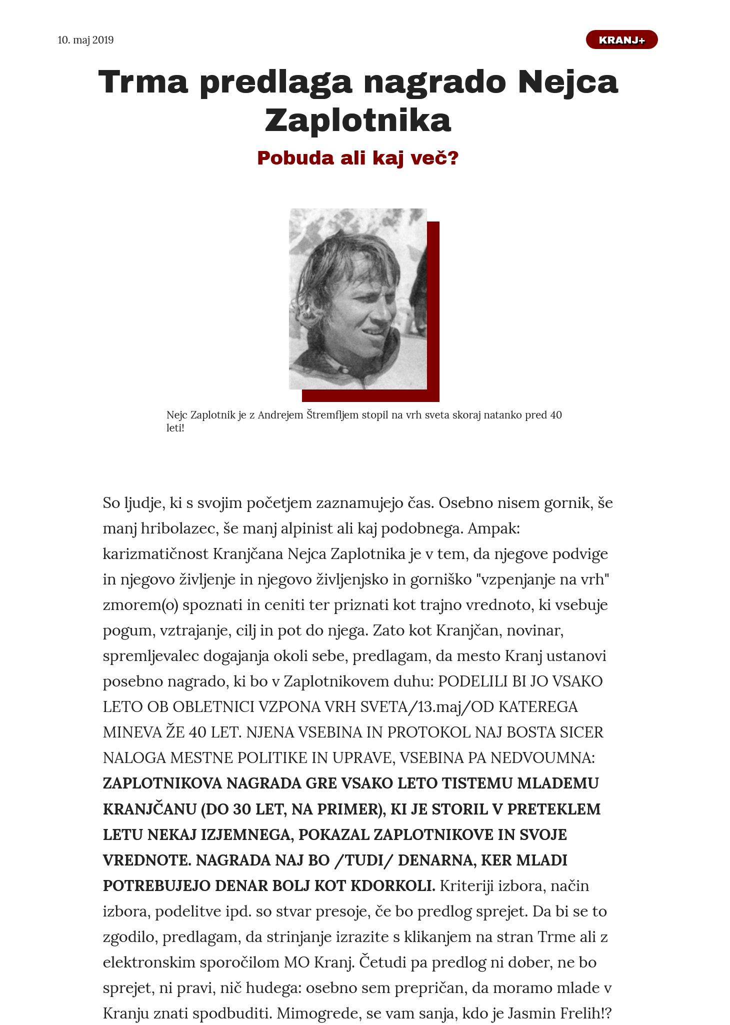 Mi skromno prispevamo k temu, da v Kranju tudi vemo, kaj je dosegel. Od leta 2015 dalje, ko osvaja Zlate cepine..... Nekoč smo javno predlagali, da Kranj nagradi uspešne, mlade, prodorne, ki pač ne pridejo skozi sito ob kulturnih društvih, folklornih skupinah ipd. /pa nič slabega o nikomer ...taka je pač konotacija nagrad, plaket ipd./