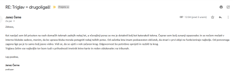 Nadaljujemo z izjavami in dobivamo tudi odzive. Prejeli smo zanimivega na temo odziva Janeza Černeta, podžupana Kranja. Današnja anketiranca sta zanimiva tudi po tem, da je bil Janez Zupančič tudi trener Jalna Pokorna. Tako pač nogomet prepleta usode znanih. Mimogrede: Janez je danes celo analitik Triglava, sodeluje s klubom kot je možno razbrati s spletne strani - Jalen pa si trenersko kariero gradi v Škofji Loki kjer imajo novega tretjeligaša. Janez pa se je očitno "ustrašil", da Trma ima cenzorja: ne ne, mi objavimo dobesedno kar dobimo - če je le podpisano. In pod svojo oceno Triglava sta se seveda podpisala oba....Spodaj pa anketirani Janez in Trmator = v nekdanjih časih, ko je Janez pripeljal Triglav v prvo ligo 1998 in bil potem zaradi neuspehov zamenjan kar pa ni spremenilo posledice: Triglav je 1999 izpadel....in se vrnil 2010!