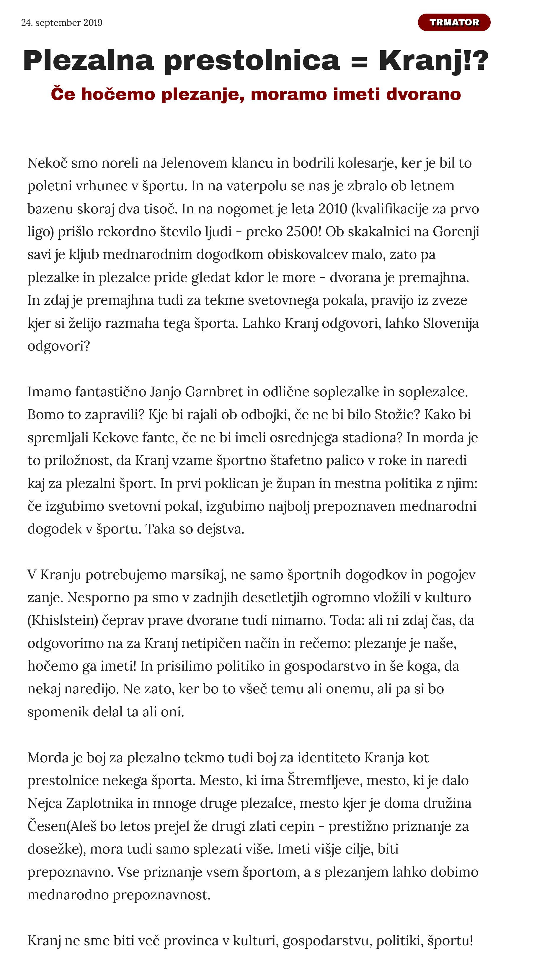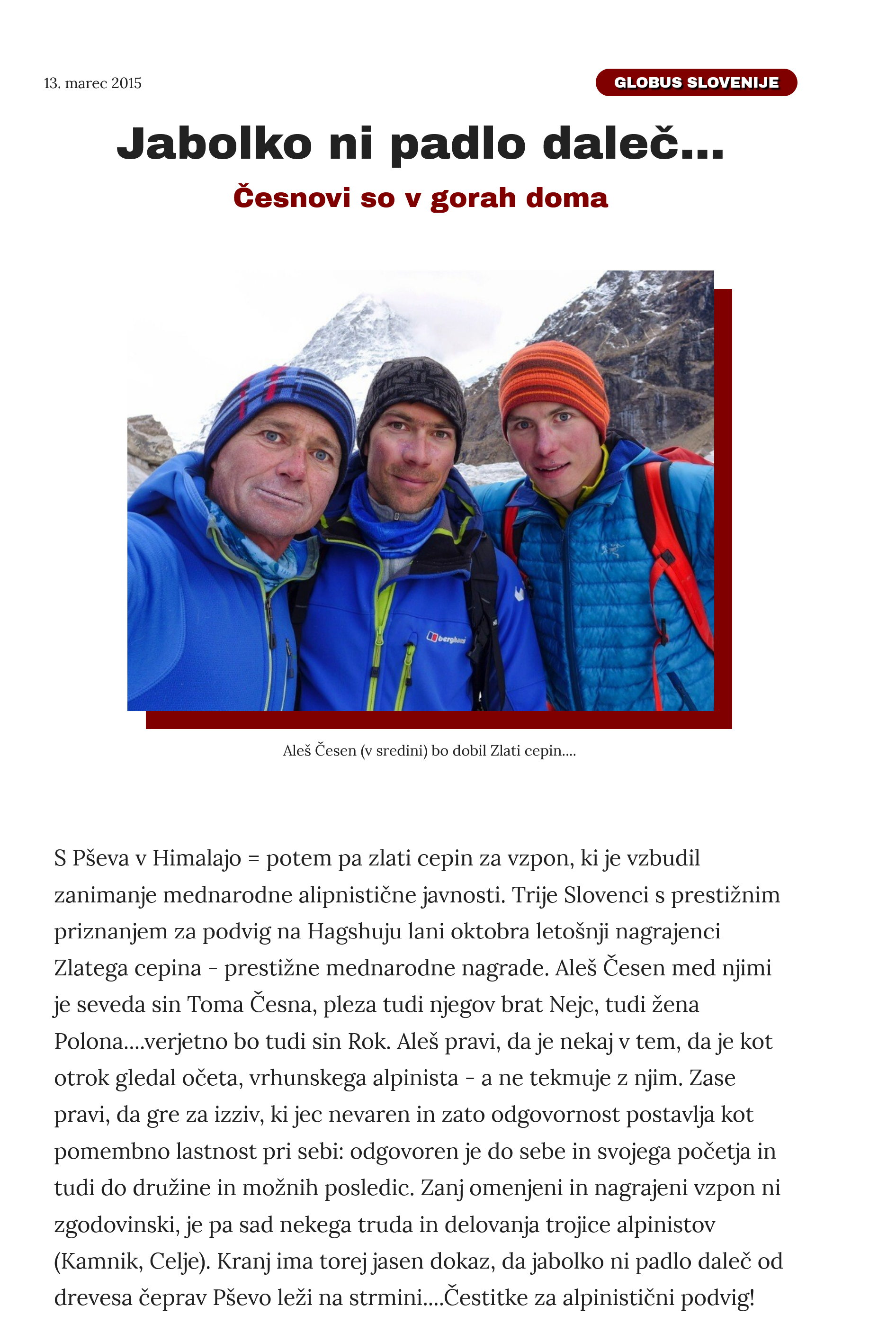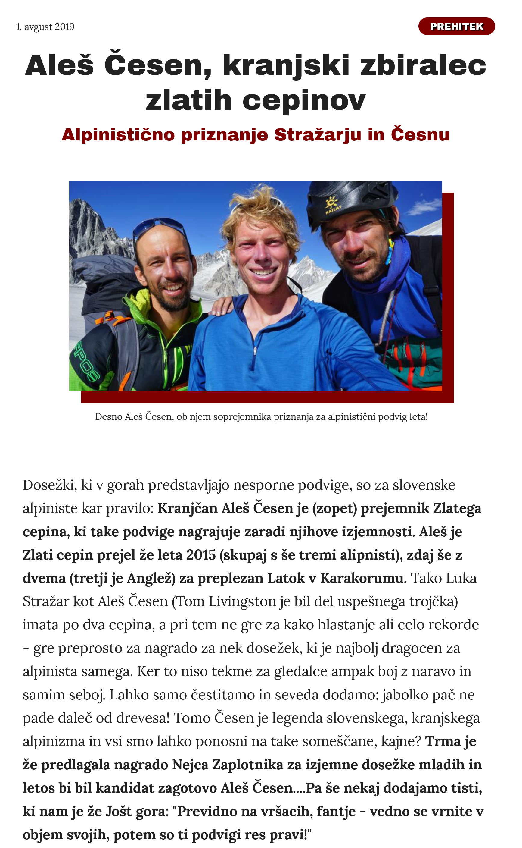 Aleš Česen je tisti, ki ta trenutek nadaljuje očetovo izročilo pa izročilo nesmrtnega Nejca Zaplotnika in številnih drugih: KRANJ JE MESTO RES IZJEMNIH HRIBOLAZCEV, ŠPORTNIKOV S PREIZKUŠNJAMI IN USPEHI PO VSEM SVETU. SMO DO ZDAJ ŽE DOŽIVELI, DA BI OB TEM PRIZNANJU ŠPORTNO NAVDAHNJENI ŽUPAN RAKOVEC STISNIL ROKO ALPINISTU VSAJ OB NJEGOVIH USPEHIH? NE VEMO, AMPAK....KRANJ JE DO ZDAJ ZAGOTOVO OB VSEM TEM OSTAL PASIVEN... NE PRVIČ IN NE ZADNJIČ! TRMA PAČ NE!!! PISALI SMO 2015, 2018 IN 2025....IN ČESTITAMO ZOPET!
