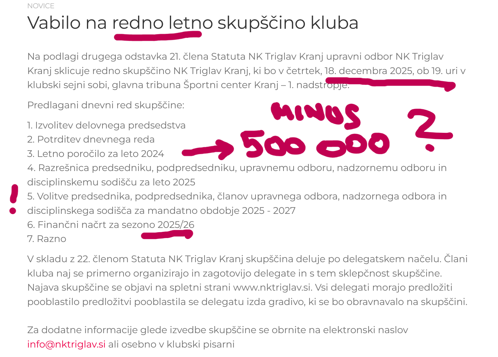 Takole so se izvolili leta 2023...zdaj se bodo ponovno. Prislana ne bo več zraven, klub pa je v tem letu doživel ponovn polom pri boju za prvo ligo: KVALIFIKACIJE SO ZAČELI SIJAJNO Z ZMAGO 3:1 V DOMŽALAH, NATO Z ISTIM NASPROTNIKOM DOMA IZGUBILI 1:4 IN OSTALI V DRUGI LIGI KJER SO JESENI PRAKTIČNO (A AUPANJE VEDNO OSTAJA...) ZAPRAVILI VSE MOŽNOSTI ZA PREBOJ, KER JE DUCAT TOČK ZAOSTANKA PAČ PREVEČ. Kaj pa finance? No, nekaj je povsem gotovo: ZAKLJULNO POROČILO ZA 2024 /VIR:ajpes/ KAŽE NA SKORAJ POL MILIJONA DOLGOV KAR JE SEVEDA ORODJE ZA VLADANJE TISTIH, KI MORDA TE DOLGOVE IZKAZUJEJO.