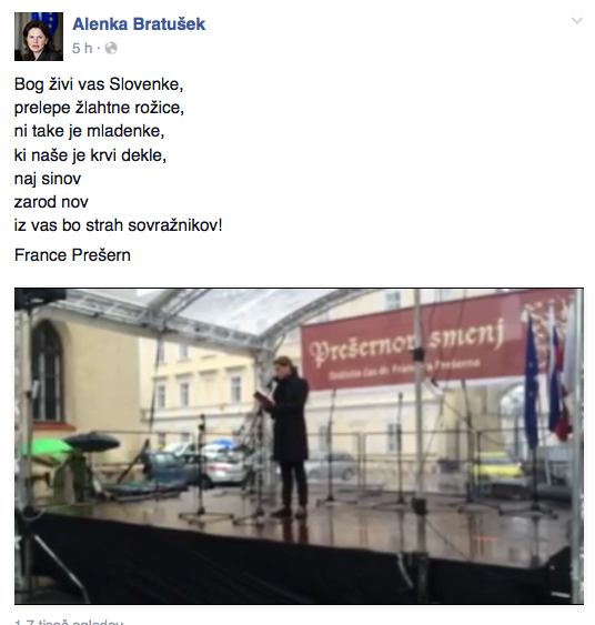 Alenka Bratušek se je na kulturni praznik odločila recitirati. V domačem, ne angleškem jeziku. No, ja - domačem? Ko je na spletu objavila svoj podvig, smo malce zardeli od sramu. Ne za nas, ki ne znamo recitirati - zanjo. Ne samo, da ni znala pravilno napisati tiste kitice ali dveh pesnikove pesmi (ki naše je... namesto ko naše je...), še Prešeren je zanjo postal Prešern.....Eh, Alenka, kaj ti je tega treba!? Volitve so še daleč...