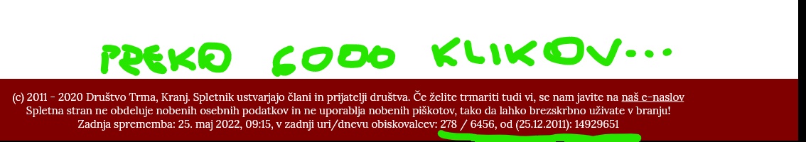 Statistika je pač univerzalna laž, pravijo. Ampak je tudi nekaj, kar šteje in prešteje. Danes je Trma medij, na katerega smo ponosni. Nas dnevno bere več kot 5000 ljudi? Nedvomno - a največkrat se branost poveča strmo, ko ljudje klikajo Trmo....KER SLEDNJA PIŠE O NEČEM, KAR DRUGI SPREGLEDAJO. NI VELIKIH IN MALIH TEM IN VSEBIN, SO LE ODZIVI, KI VSE POVEDO. Trma.si je torej na poti proti 15 000 000 klikom kar je rekord rekordov za nek lokalni medij. KER SMO IN BOMO PREDVSEM MEDIJ KRANJA IN OKOLICE, A NE BEŽIMO OD GORENJSKIH, SLOVENSKIH VSEBIN....