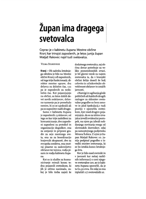 Premislite nov kranjski biser hinsvščine in sprenevedanja: je mogoče biti član IO Več za Kranj in se podpisati pod oglas kjer je "napadena" občina, njen legitimno izvoljeni župan in - prejemati plačo na isti občini, ki ti še pomaga pri diplomski nalogi ipd.? Je mogoče, to je etično in logično in politično korektno: dopoldne delam za župana, popoldne pa malo "pljunem" po njem!? In mimogrede: sem v povezavi z bivšim županom, zdaj svetnikom, ki pa poudarja ravno tak odnos - a ne doma pri sebi ampak drugod: ČE NEKDO SVETUJE ŽUPANU, NE MORE IN NE SME POPODLNE PISATI O OBČINI IN NJENIH IZPOSTAVLJENIH URADNIKIH IPD. KER S TEM BLATI OBČINO KJER PREJEMA SREDSTVA PO POGODBI!? PREPROSTO: ČE TE KUPIMO S POGODBO, BOŠ UTIHNIL = LOGIKA MESTNEGA SVETNIKA!? S POUDARKOM: TRMA NI PLAČANA IZ JAVNEGA DENARJA, JE DRUŠTVENA IN OSEBNA ZGODBA IN NIČ VEČ IN NIČ MANJ. IN ZDAJ ŠE DRUGO NASPROTJE: DOPOLDNE DELAM ZA PLAČILO IZ JAVNEGA DENARJA /KOT SVETOVALEC/ POPOLDNE PA "PLJUVAM" SVETOVALCA IPD. KOT DEL VRHA POLITIČNE STRANKE? TO PA JE PRAV IN ETIČNO IN MORALNO IN PRAVILNO, KAJNE? ZATO JE TREBA KRITIČNE ZAPISE USTAVITI IN SEVEDA POZDRAVITI POLITIČNO AKCIJO, KI SE V BISTVU DOGAJA KAR DOMA?! Priznam, takega sprenevedanja pa še ne. Napada me nekdo, ki je izvoljen v politično vodstvo stranke in njen član je bivši župan in bivši predsednik iste stranke - nič nimam proti. Naj bodo le merila za vse enaka: če nekdo dopoldne dela na občini, lahko popoldne obsoja ravnanja župana? Prav. Če nekdo svetuje občini dopoldne, poterm lahko popoldne piše kar hoče (po ustavi zajamčeno...)? NE, TO PA NE!
