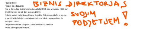 Pomislite: imamo preštetih 14 300 000 klikov na Trmo. Ki je..kranjski spletnik! Ki promovira - Kranj. Vsak dan. Stalno. Na vse načine. PA NAM ZAVOD ZA TURIZEM IN KULTURO NIČ NE PLAČA? OPALA: DOMALA VSAK DAN OD KOGA SLIŠIMO, DA TA IN TA POLITIK OBLJUBLJA NAGRADO, ČE KDO ZNA RAZKRITI, KAKO JE TRMA PLAČANA OD OBČINE, ŽUPANA, TEGA ALI ONEGA! JA, HUDIČA: SAJ SE TO DA UREDITI...KOT JE TO UREDIL JAVNI DIREKTOR JAVNEGA ZAVODA IN NAŠ JAVNI DENAR NAMENIL GOSPODARNO ZA PROMOCIJO KRANJA. OPALA ŠTEVILKA DVE: SAJ TAM SE KRANJA ŠE VIDI NE, ČE LUČKE IZVZAMEMO...JE PA MARIBORSKI FIČKO! MI PA IMAMO TAKOJ, KO KLIKNEŠ NA TRMO - KRANJ "V GLAVI" ! TOREJ????