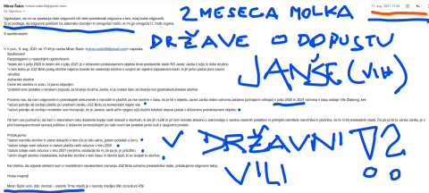 Država je bila tiho na naša vprašanja o računih za dopustovanje družine predsednika vlade v letih 2020 in 2021 (obakrat po en teden, v vili Zlatorog, ocena cen obeh dopustovanj skupaj 25 000 evrov)! TERJALI SMO DOKAZILA O PLAČILU IN ZNESKIH, KI SO BILI PLAČANI LANI IN LETOS - DOPUST KOT TAK NAS NI MOTIL OZIROMA NI BIL PREDMET POIZVEDOVANJ, KER VILO LAHKO NAJAME VSAK! Naslovnik na naša vprašanja ni odgovoril, nastopil je "molk organa" in vključila se je pooblaščenka za dostop do informacij javnega značaja. Pa zopet ni šlo, kljub ponovno določenemu krajšemu roku za odgovor z Brda. ZDAJ SMO NA DOBRI POTI, DA SE NEKAJ ZGODI. KAJTI Z BRDA SO SPOROČILI, DA NIMAJO NAŠEGA NASLOVA, KI JE SEVEDA JASNO DOSTOPEN V RAZVIDU MEDIJEV MINISTRSTVA ZA KULTURO....PA SMO JIM GA LJUBEZNIVO SPOROČILI....Tajnica direktorja in po njegovi trditvi tudi tiskovna predstavnica JGZ Brdo in Marjana Hribarja sicer direktorja spremlja na kakšni zastonj večerji (beri: Dolga miza v Kranju), ni pa ji uspelo najti našega naslova brez naše pomoči in radi smo pomagali...ČAKAMO POŠTARJA! PO SKORAJ NATANČNO DVEH MESECIH BOMO DOBILI ODGOVOR. BO ZADOVOLJIV? NO, BOMO VIDELI....