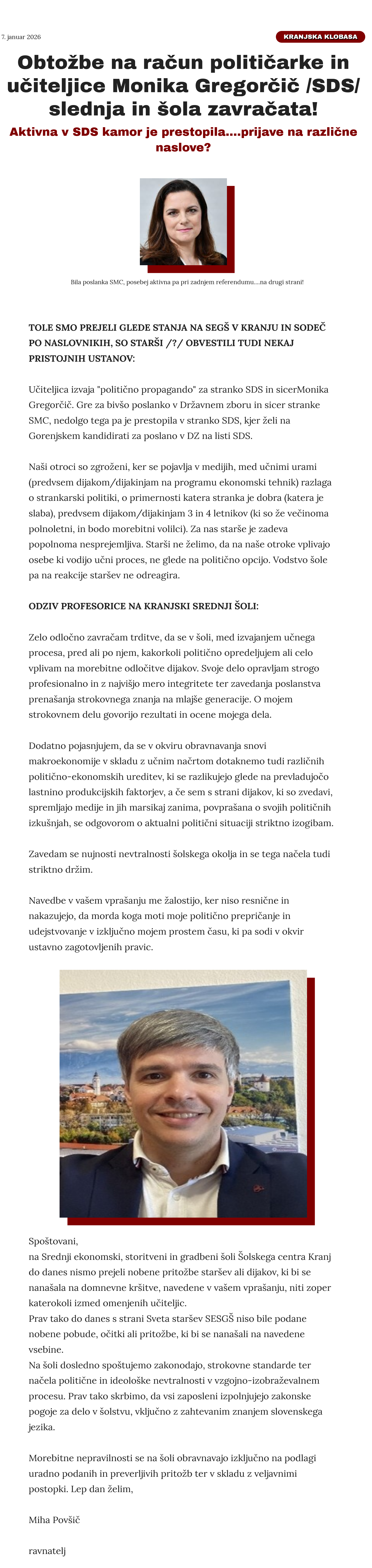 Imamo v Kranju novo zvezdo SDS...kjer je dolgoletnega predsednika nadomestil Bojan Homan, ki vodi kranjsko SDS? Ne vemo, vemo pa, da pogovor s šefom vseh šefov, ki stranko vodi tri desetletja, ni prepuščen komurkoli! Sicer pa smo v januarju objavili očitke in odgovore glede tega, da profesorica Monika tudi med delom na srednji šoli agitira za ....no, preberite!