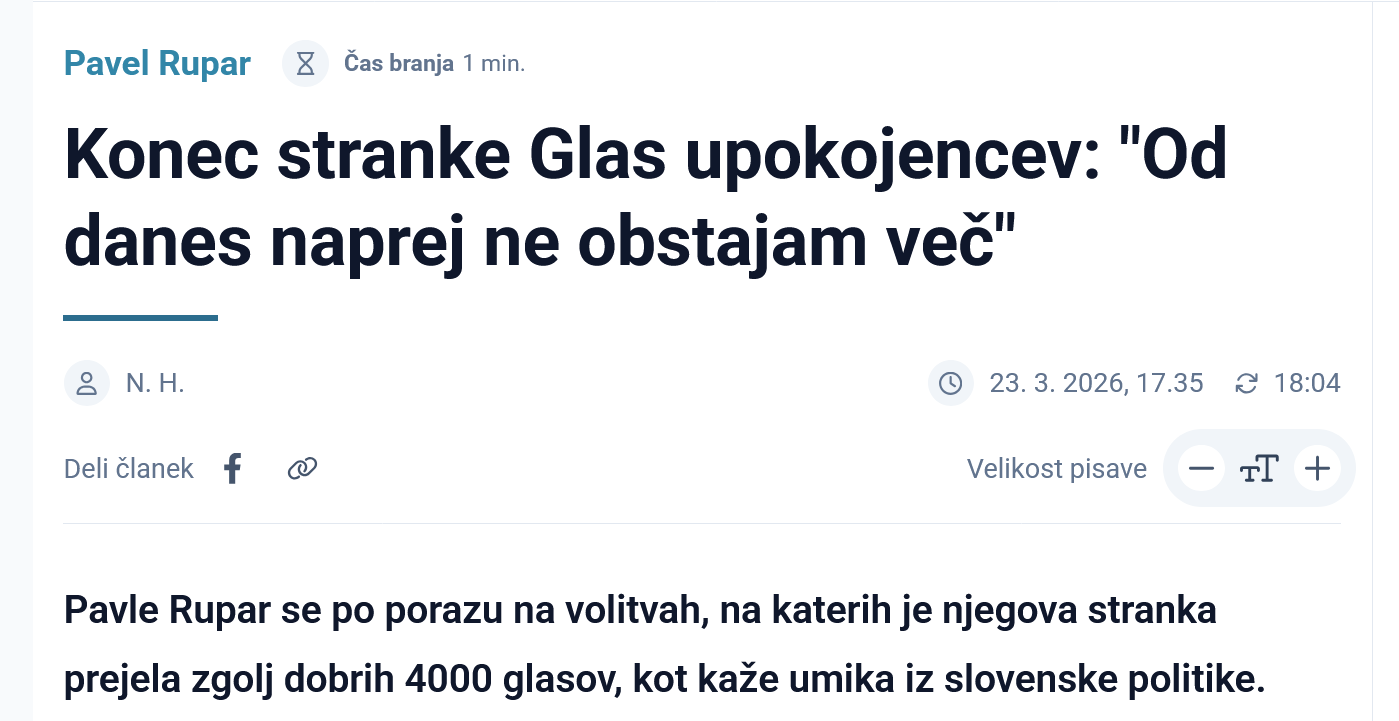 Danes se poslavljam od vas kot predsednik stranke Glas upokojencev Pavla Ruparja! Od danes naprej ne obstajam več! Sklenili smo, da prenehamo z delom in bojem za majhne pokojnine, božičnice, poprave krivic.. Vsaj jaz se tega ne grem več! Načrte za gradnjo dveh Hospicev sem umaknili, namesto v Sloveniji jih bom gradili v Bosni v, Međugorju, tam so ljudje še hvaležni!