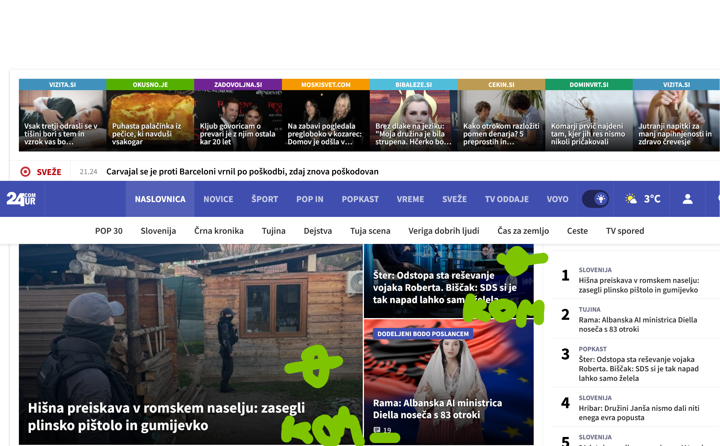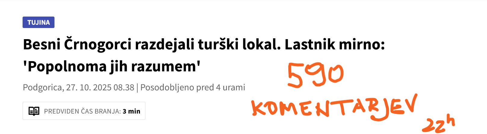 Šefi komercialne televizije so na svojem spletnem portalu 24 ur onemogočili komentiranje. Prav: to je njihova pravica, so tržna televizija, zanjo ne plačujemo naročnine. SEVEDA TO VELJA SAMO ZA ZAPISE, KI SO POVEZANI Z DOGODKI IZ NOVEGA MESTA, DOLENJSKE IN.... Zakaj je to kriterij in zakaj je taka demonstracija medijske svobode potrebna, ne vemo. Če torej ne smete in ne morete zapisati svojega mnenja ob uboju v dolenjski prestolnici, se lahko "sprostite" drugače. Neka druga novica teh omejitev nima....
