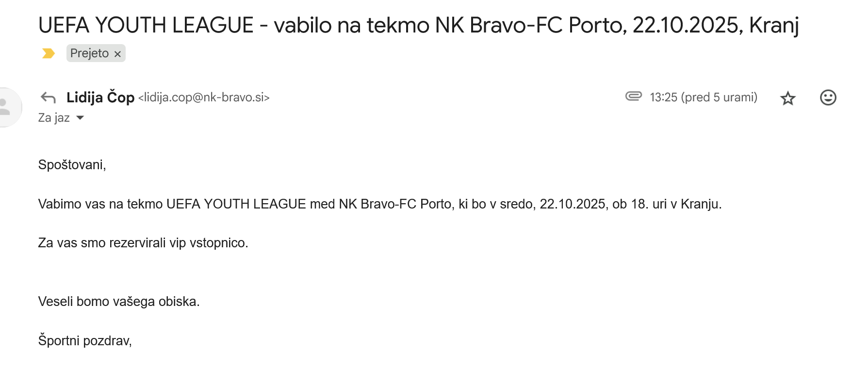 Vabilo mojega nogometnega soborca je torej zdravilo. Z veseljem bom bodril malde nogometaše v pomembni evropski tekmi kjer NK Triglav=Kranj igra samo vlogo gostitelja in nič več. Nismo tisti, ki bi v bordo dresih dokazali gorenjsko trmo, smo le sopotniki, ker je sedanje vodstvo klub dobesedno potegnilo v športno anonimnost....Žal. Ne pričakujem vabila od njih, še manj ga potrebujem. Zato pa so se me spomnili tisti, ki danes v mnogočem znajo in zmorejo uveljaviti slovenski nogomet skozi slovenske fante in slovenski klub. Čestitam.