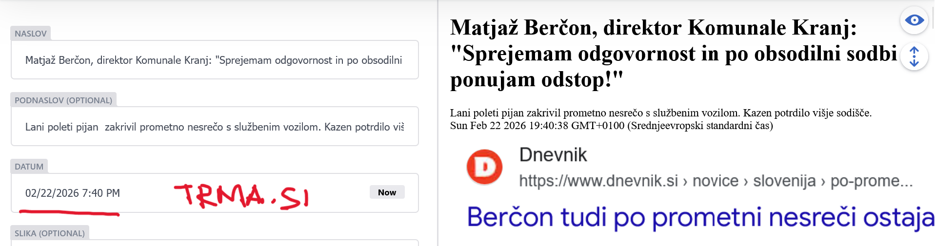 Trma.si je dne 22.2. 2026 objavila zgodbo in sicer zvečer, prilagamo dokaz.