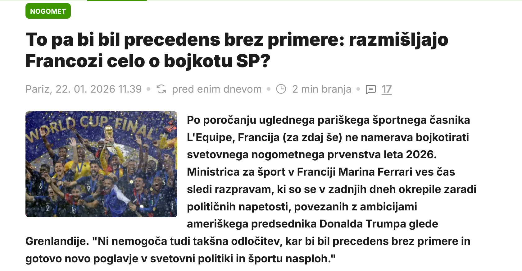 Nogomet in šport naj bi bila izven politike. Toda samodržec je med tem postal predsednik organiozacijskega komiteja SP, preimenoval je Mehiški zaliv in zdaj ponovno grozi Kanadi - da Grenlandije in vsega ostalega ne omenjam. Če bi nogometne velesile znale ustvariti pritisk, potem bi bila "nogometna sankcija" lahko nekaj najhujšega kar bi ga doletelo.