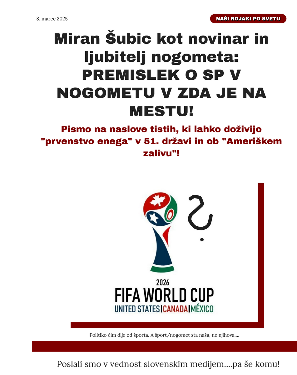 Nogomet in šport naj bi bila izven politike. Toda samodržec je med tem postal predsednik organiozacijskega komiteja SP, preimenoval je Mehiški zaliv in zdaj ponovno grozi Kanadi - da Grenlandije in vsega ostalega ne omenjam. Če bi nogometne velesile znale ustvariti pritisk, potem bi bila "nogometna sankcija" lahko nekaj najhujšega kar bi ga doletelo.